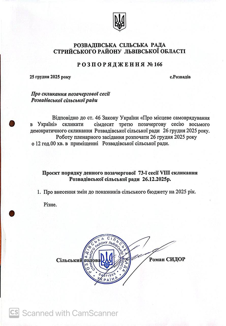 26 грудня 2025 року о 12:00 год у приміщенні Розвадівської сільської ради відбудеться 73-а позачергова сесія 8-го скликання Розвадівської сільської ради.