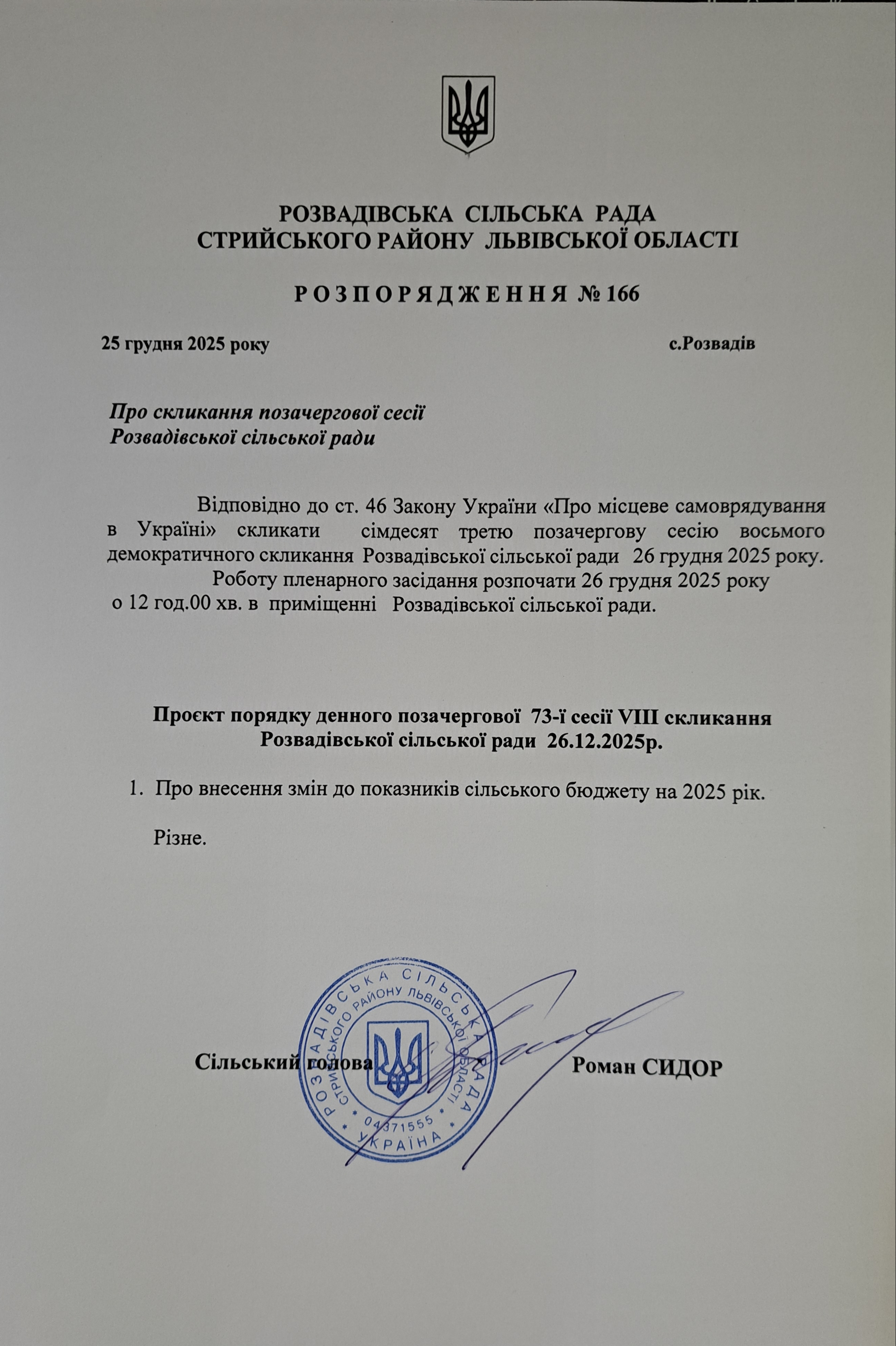 Відбудеться позачергова 73-тя сесія VIII скликання Розвадівської сільської ради