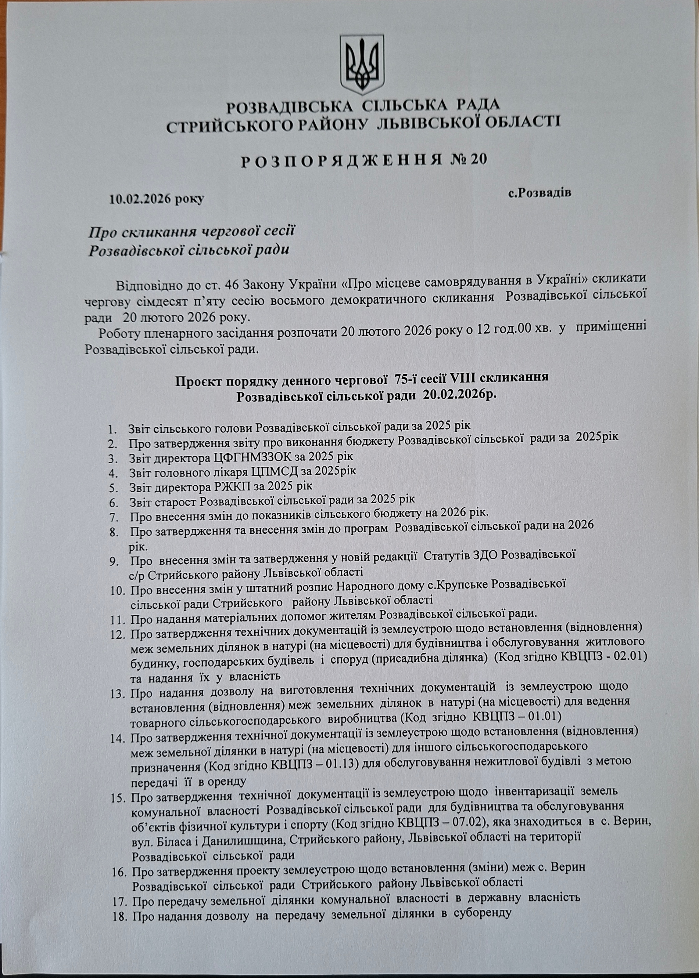 20 лютого 2026 року о 12:00 год у приміщенні Розвадівської сільської ради відбудеться 75-а чергова сесія 8-го скликання Розвадівської сільської ради.
